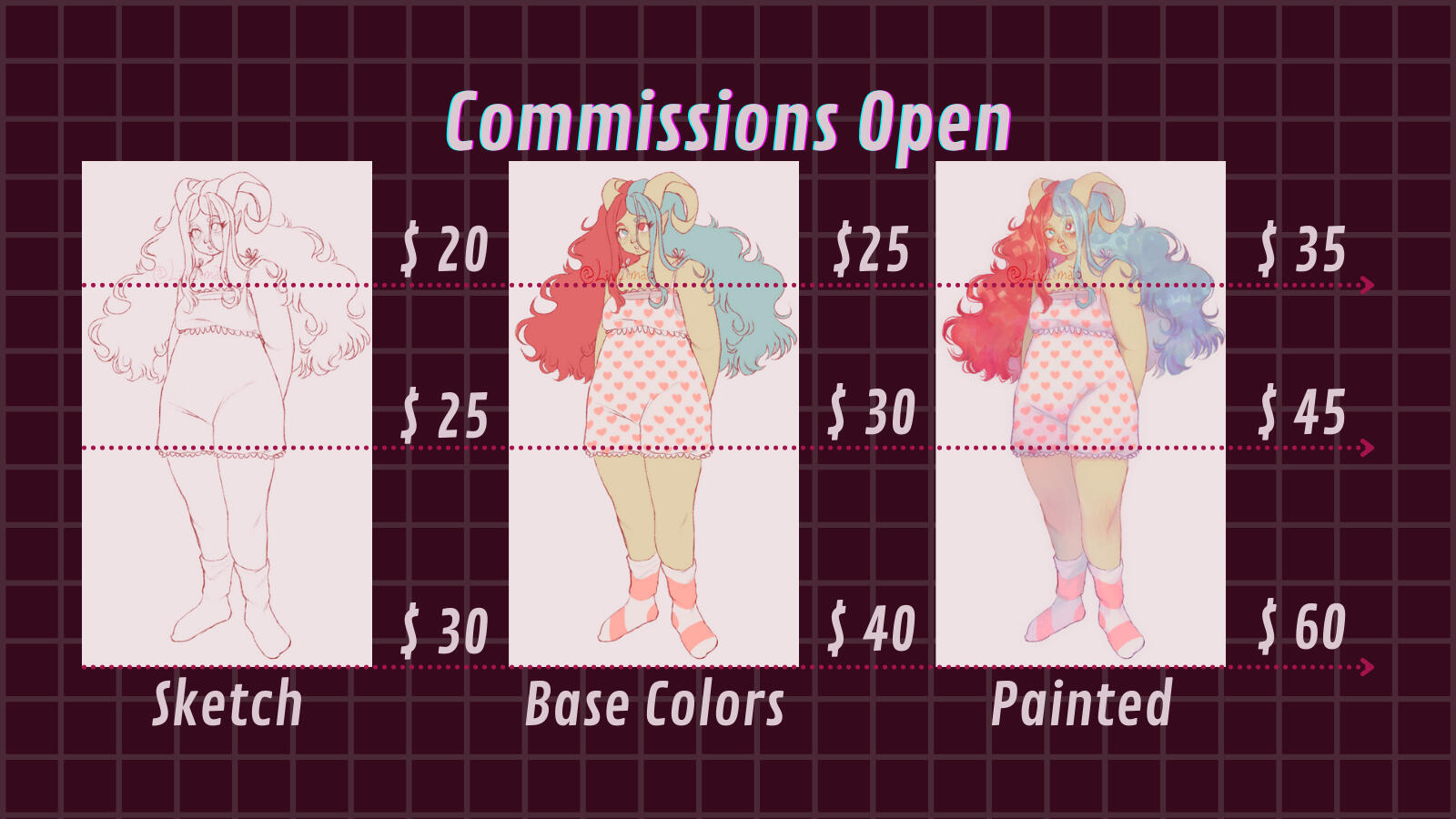◆The base prices in my sheet are for PERSONAL USE ONLY. For commercial use art, I recommend more experienced artists.◆I DO NOT make refunds after delivery and subsequent payment of the first sketch in cases of cancellation. If you need to cancel, please don't wait until the sketch is delivered.◆Payment is 50% after the first sketch is delivered, and 50% before the final product is delivered.◆Order updates will be watermarked until full payment is made.